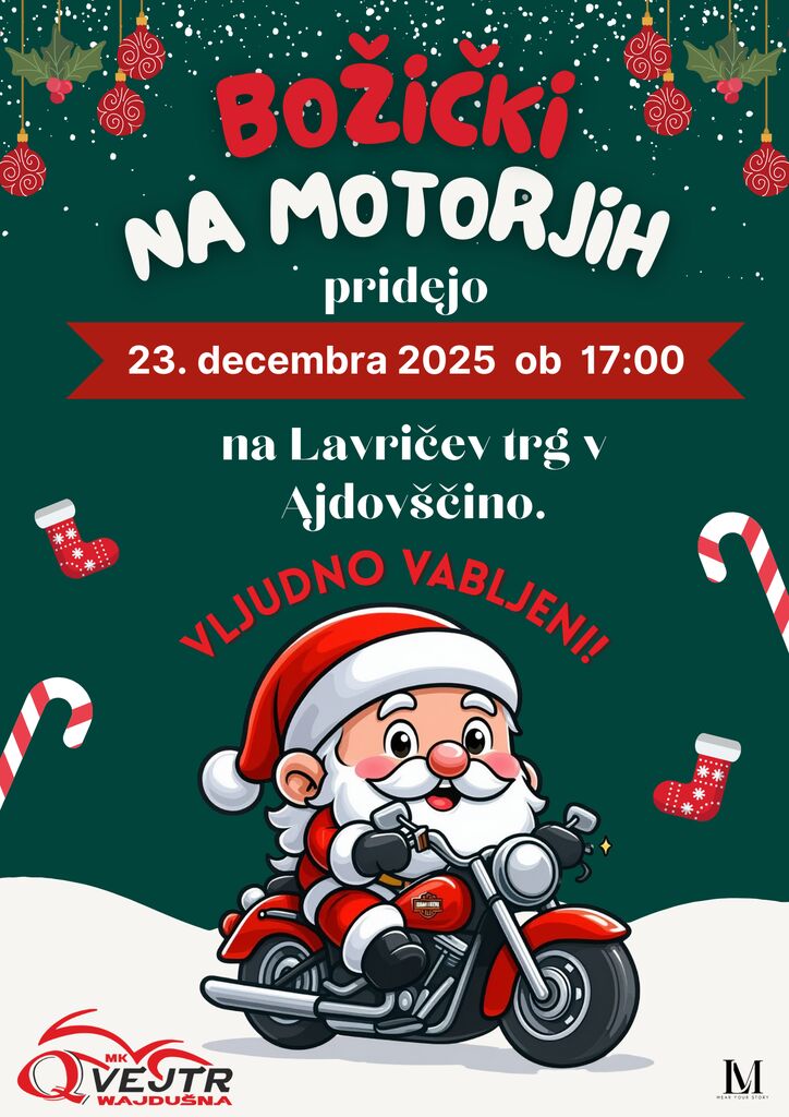 Motoristi in simpatizerji Moto Kluba Q VEJTR WAJDUŠNA smo se odločili, da tudi na ta Božič ne bomo osrečili le otrok s posebnimi potrebami iz zavoda Cirius kot prejšnja leta, ampak tudi ostale otroke iz Vipavske doline. Zato bomo oblečeni v Božičke na motorjih 23. 12. 2025 obiskali gojence VDC-jev Ajdovčina in Vipava, otroke v vrtcih Ajdovščine, Budanj, Vrhpolj, Vipave, Ustje, Dobravlje, Črniče ter seveda gojence zavoda Cirius v Vipavi. Kdaj kam pridemo, bomo pravočasno obvestili predstavnike teh ustanov. Na koncu se bomo z zabavno točko predstavili še otrokom in staršem, ki bodo prišli popoldan ob 17h na ajdovski Lavričev trg. Lepo vabljeni.