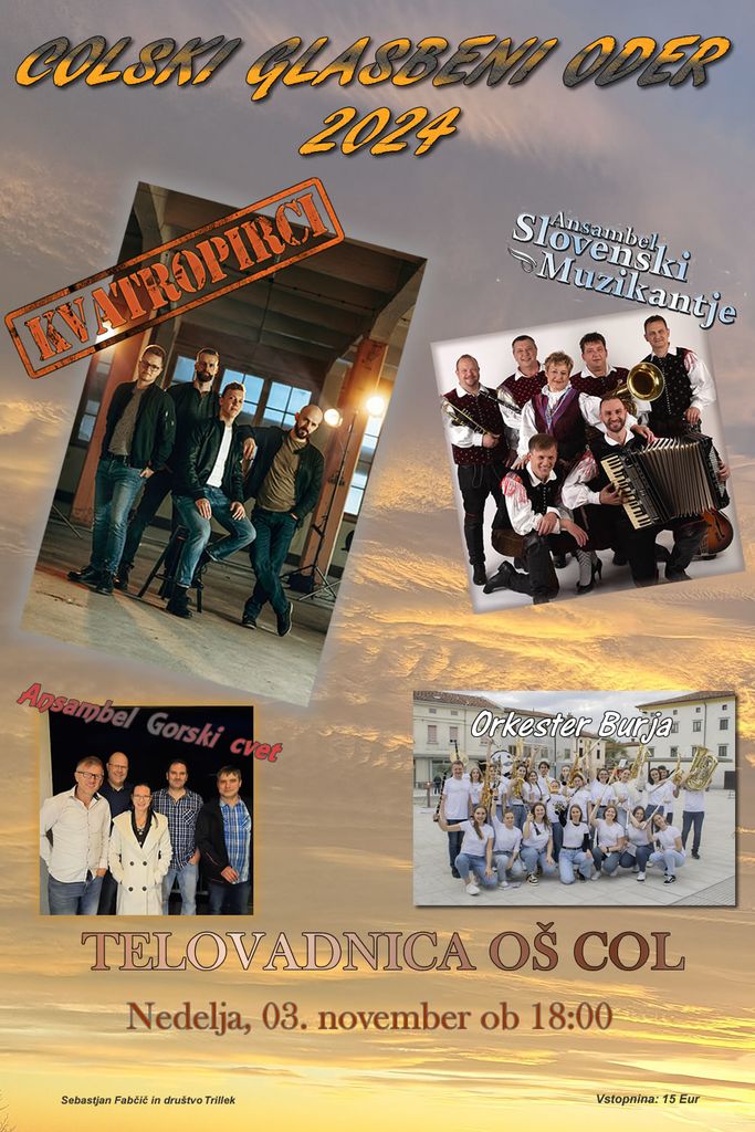COLSKI GLASBENI ODER. Tradicionalna jesenska glasbena prireditev, ki na Colu nad Ajdovščino poteka od leta 2005. Glasbeni dogodek na katerem se predstavljajo domači in glasbeni ustvarjalci in izvajalci od drugod. Letos bodo nastopili: Kvatropirci, Ansambel Slovenski muzikanti, Gorski cvet in orklester Burja. Program bosta povezovala člana gledališke ekipe društva Trillek Manca Kovač Likar in Matjaž Bajec. Vabljeni v nedeljo, 03. novembra ob 18.00 v športno dvorano Osnovne šole Col.