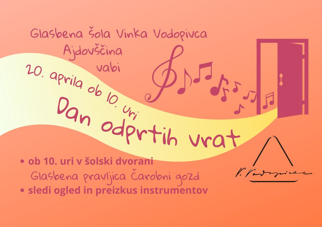 Glasbena šola Vinka Vodopivca Ajdovščina v soboto, 20. aprila, odpira vrata in predstavlja svoje delovanje. Ob 10. uri boste skozi vrata šolske dvorane vstopili v glasbeno pravljico Čarobni gozd, v kateri boste slišali različne instrumente in spoznali, kakšno moč ima glasba. Po zaključku pravljice bomo odprli še vrata naših učilnic, za katerimi se skrivajo vsa glasbila, ki jih pri nas poučujemo. Lahko jih boste tudi preizkusili in se morda odločili, da se nam septembra pridružite. Vabljeni!