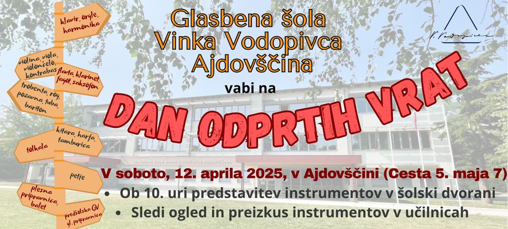 Glasbena šola Vinka Vodopivca Ajdovščina pripravlja DAN ODPRTIH VRAT v soboto, 12. aprila 2025. Ob 10. uri boste v šolski dvorani prisluhnili instrumentom, nato pa se boste sprehodili po učilnicah in glasbila videli čisto od blizu ter jih tudi preizkusili.