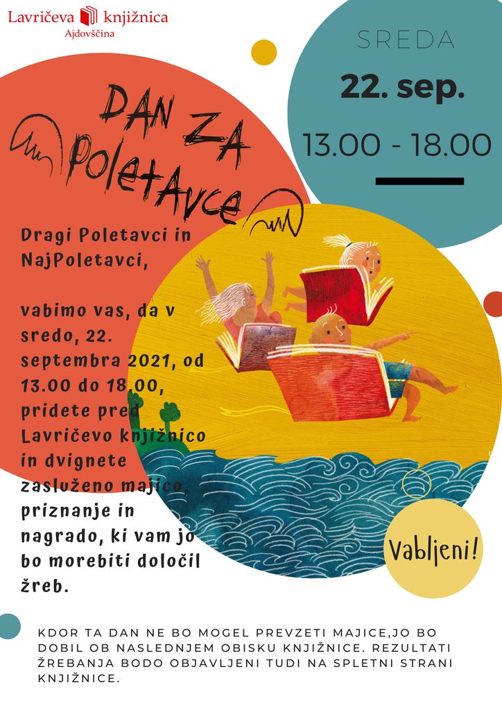 Dan za Poletavce bo v sredo, 22. septembra 2021, od 13. do 18. ure, ko boste pred Lavričevo knjižnico Ajdovščina lahko dvignili majice in priznanja ter nagrade, ki jih bo določil žreb.