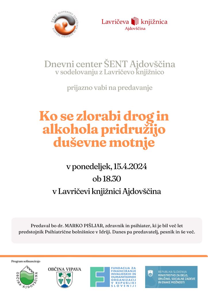 Dnevni center ŠENT v sodelovanju z Lavričevo knjižnico prijazno vabi na predavanje KO SE ZLORABI DROG IN ALKOHOLA PRIDRUŽIJO DUŠEVNE MOTNJE.