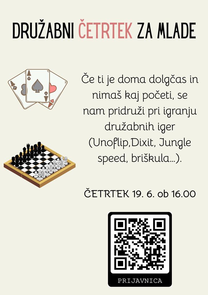 Če ti je doma dolgčas in nimaš kaj početi, se nam v četrtek, 19. 6. ob 16.00 pridruži pri igranju družabnih iger (Unoflip,Dixit, Jungle speed, briškula…).