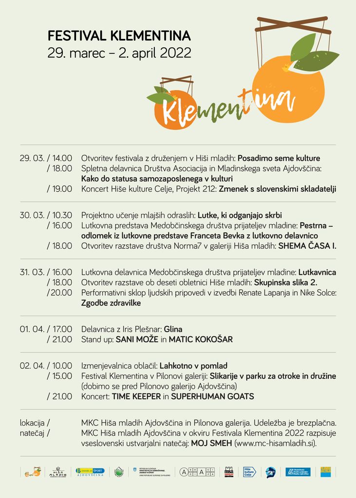 29.03.2022 - 02.04.2022 / 14:00V AJDOVŠČINI BO MED 29. MARCEM IN 2. APRILOM POTEKAL FESTIVAL KLEMENTINA 2022