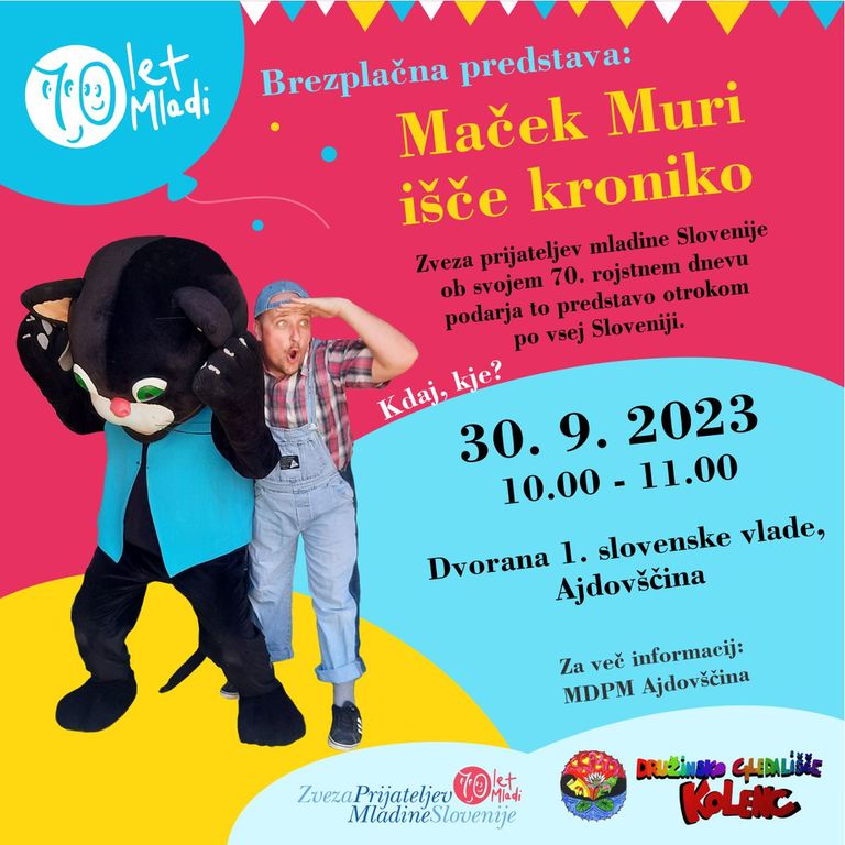 Brezplačna gledališka predstava MAČEK MURI IŠČE KRONIKO bo odprla celotedenski, vsebinsko bogat, Teden otroka ®, ki ga organizira Medobčinsko društvo prijateljev mladine Ajdovščina. Predstavo otrokom ob svojem 70'. rojstnem dnevu poklanja ZPM Slovenije.