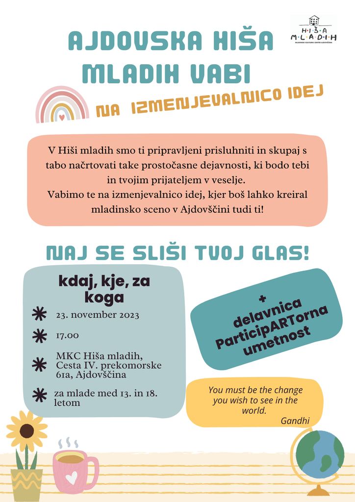 V četrtek, 23. 11., ob 17.00, vabimo vse mlade (13+), ki bi želeli sooblikovati mladinsko sceno v Ajdovščini in okolici, na že tradicionalno mesečno Izmenjevalnico idej. Naša mladinska delavka bo z veseljem prisluhnila vašim idejam ali vam pomagala do uresničitve vašega projekta.