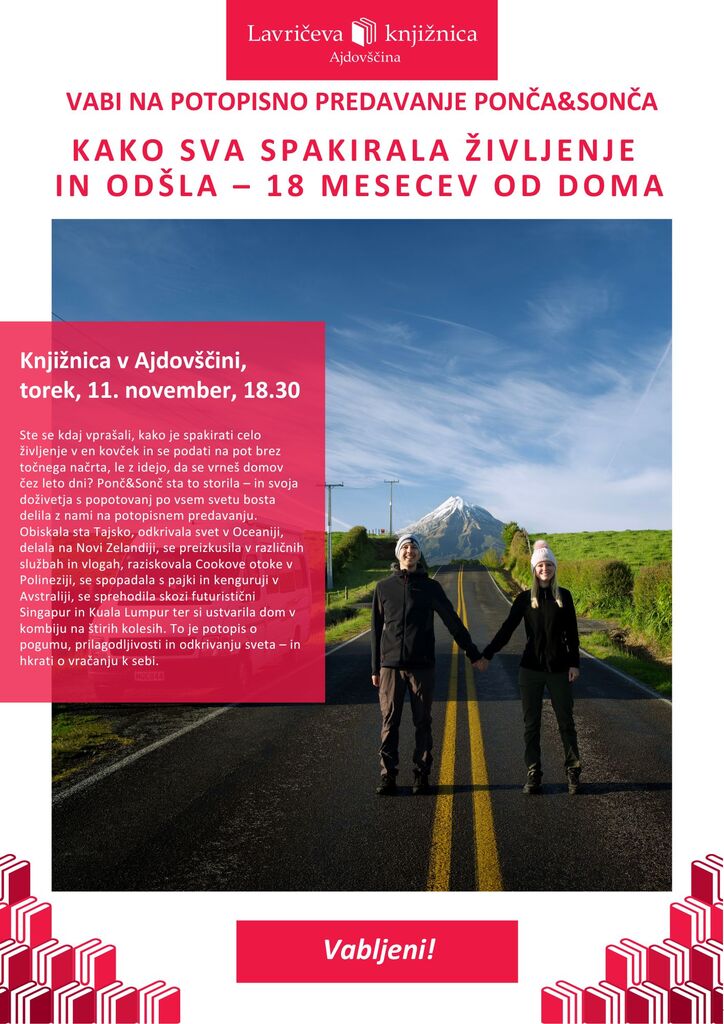 V torek, 11. novembra, ob 18.30 vas vabimo v knjižnico v Ajdovščino na potopisno predavanje z naslovom Kako sva spakirala življenje in odšla.