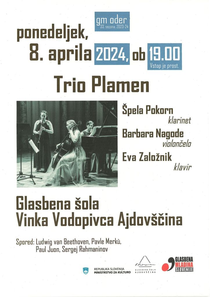 Vabljeni na koncert iz cilka GM oder, ki bo v ponedeljek, 8. aprila, ob 19. uri v šolski dvorani. Vstop je prost.
