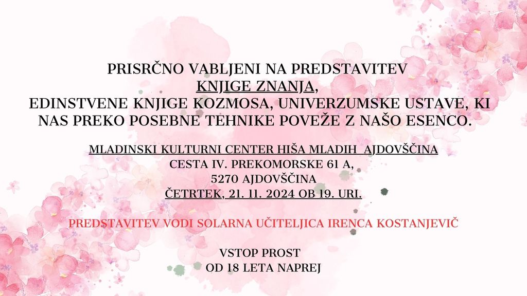Predstavitev Knjige Znanja bo potekala v prostorih Mladinski kulturni center Hiša Mladih Ajdovščina, 21. novembra, ob 19. uri.