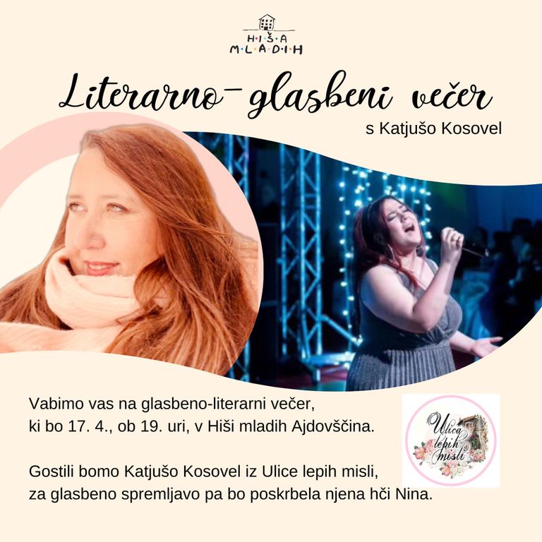 Vabimo vas na literarno-glasbeni večer, 17. aprila, ob 19. uri, v avlo Hiše mladih, kjer bomo gostili Katjušo Kosovel iz Ulice lepih misli ter njeno hči Nino Kosovel, ki bo poskrbela za lepo glasbeno spremljavo večera.