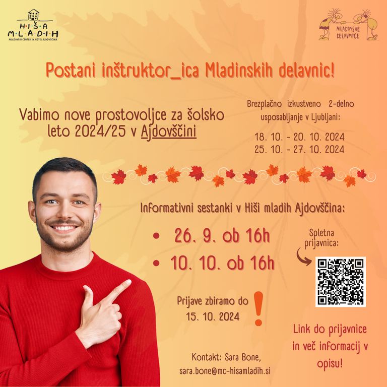 Če te to področje zanima in bi želel_a izvedeti še več, se obrni na koordinatorko delavnic v Hiši mladih Saro Bone (sara.bone@mc-hisamladih.si, 041 945 392). Vse zainteresirane vabimo tudi na informativni dan, ki bo 26. 9. 2024, ob 16. uri, v Hiši mladih.