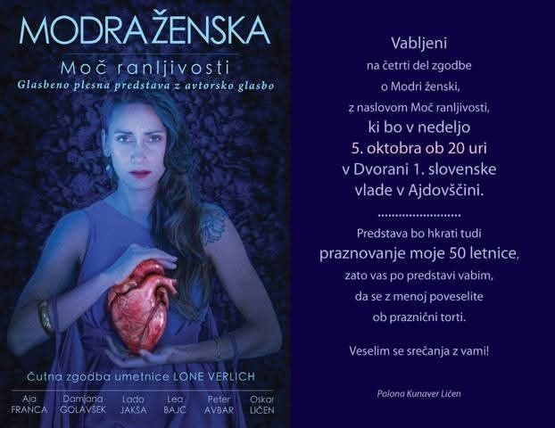 Vabljeni na četrti del zgodbe o Modri ženski z naslovom Moč ranljivosti. Je glasbeno plesna predstava z avtorsko glasbo. Je čutna zgodba umetnice Lone Verlich. Poleg avtorice v predstavi sodelujejo: Aja Franca, Damjana Golavšek, Lado Jakša, Lea Bajc, Peter Avbar in Oskar Ličen.