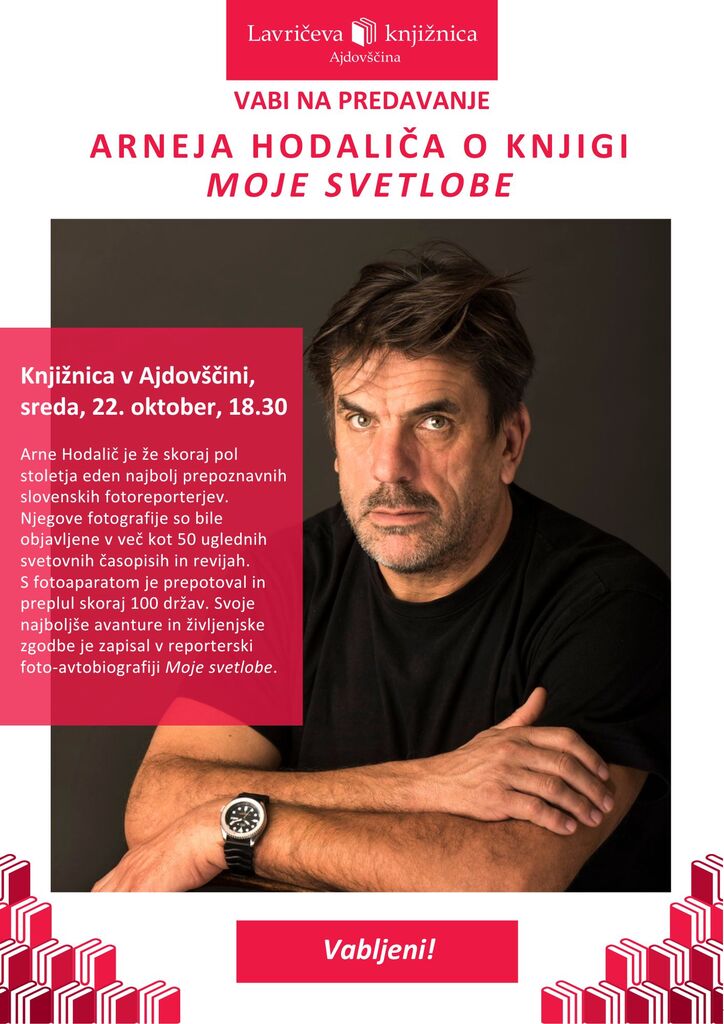 Arne Hodalič je že skoraj pol stoletja eden najbolj prepoznavnih slovenskih fotoreporterjev. Njegove fotografije so bile objavljene v več kot 50 uglednih svetovnih časopisih in revijah. S fotoaparatom je prepotoval in preplul skoraj 100 držav. Svoje najboljše avanture in življenjske zgodbe je zapisal v reporterski foto-avtobiografiji Moje svetlobe. Knjiga ni le zbirka spektakularnih dogodivščin, temveč iskren pogled v najodmevnejše reportaže, nore avanture, osebna ozadja in potovanja po najbolj skritih kotičkih našega planeta. Arne ima neusahljivo strast do raziskovanja in pripovedovanja zgodb, ki nas bodo nasmejale in navdušile. Tokrat nas bo popeljal na različne konce sveta in z nami delil zgodbe in fotografije najbolj norih pustolovščin za katere pravi: »Še zdaj komaj verjamem, da sem vse to res doživel!«