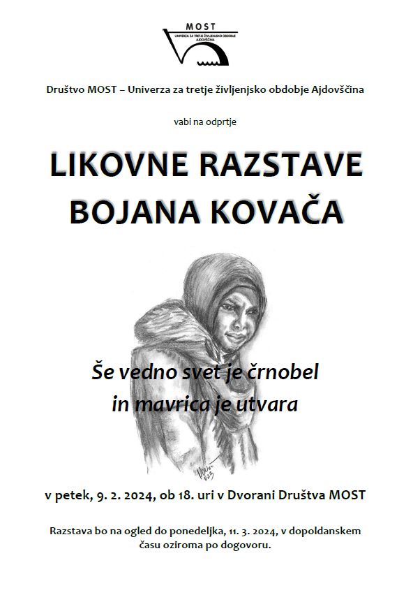 Bojan Kovač, član Društva MOST, se bo na četrti samostojni likovni razstavi predstavil s ciklusom portretov, živalskih likov in človeških figur v tehniki oglje-papir. Razstavljena dela so nastala v prvi polovici študijskega leta 2023/24 pod mentorstvom Silve Copič.