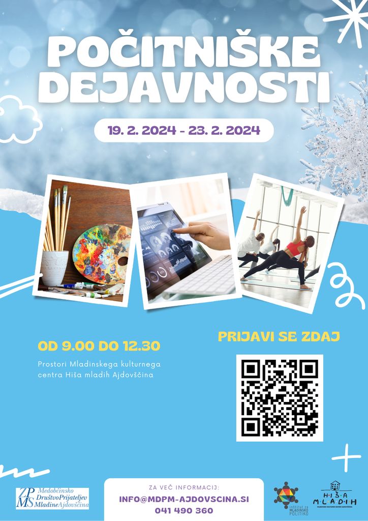 V času zimskih počitnic bodo od ponedeljka, 19. februarja, do petka, 23. februarja, med 9. in 12.30 uro v Hiši mladih Ajdovščina potekale zabavne delavnice za osnovnošolce, v katerih bomo razgibali telesa, likovno ustvarjali, se družili v naravi, spoznavali digitalne vsebine in še mnogo več. Udeležba je brezplačna.