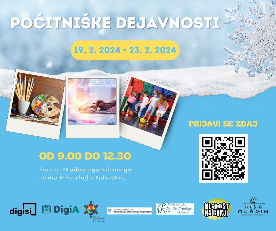 Inštitut za mladinsko politiko v sodelovanju z Medobčinskim društvom prijateljev mladine Ajdovščina vabi otroke in mlade na brezplačne počitniške delavnice, ki bodo potekale od 19. do 23. februarja 2024 v prostorih Mladinskega kulturnega centra Hiša mladih Ajdovščina.