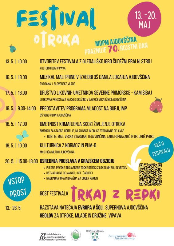 MEDOBČINSKO DRUŠTVO PRIJATELJEV MLADINE AJDOVŠČINA praznuje 70. rojstni dan. V tednu med 13. in 20. majem se bo na različnih lokacijah v Vipavi in Ajdovščini odvijal FESTIVAL OTROKA.