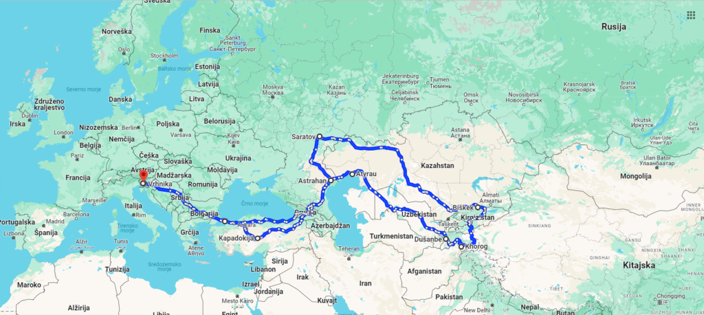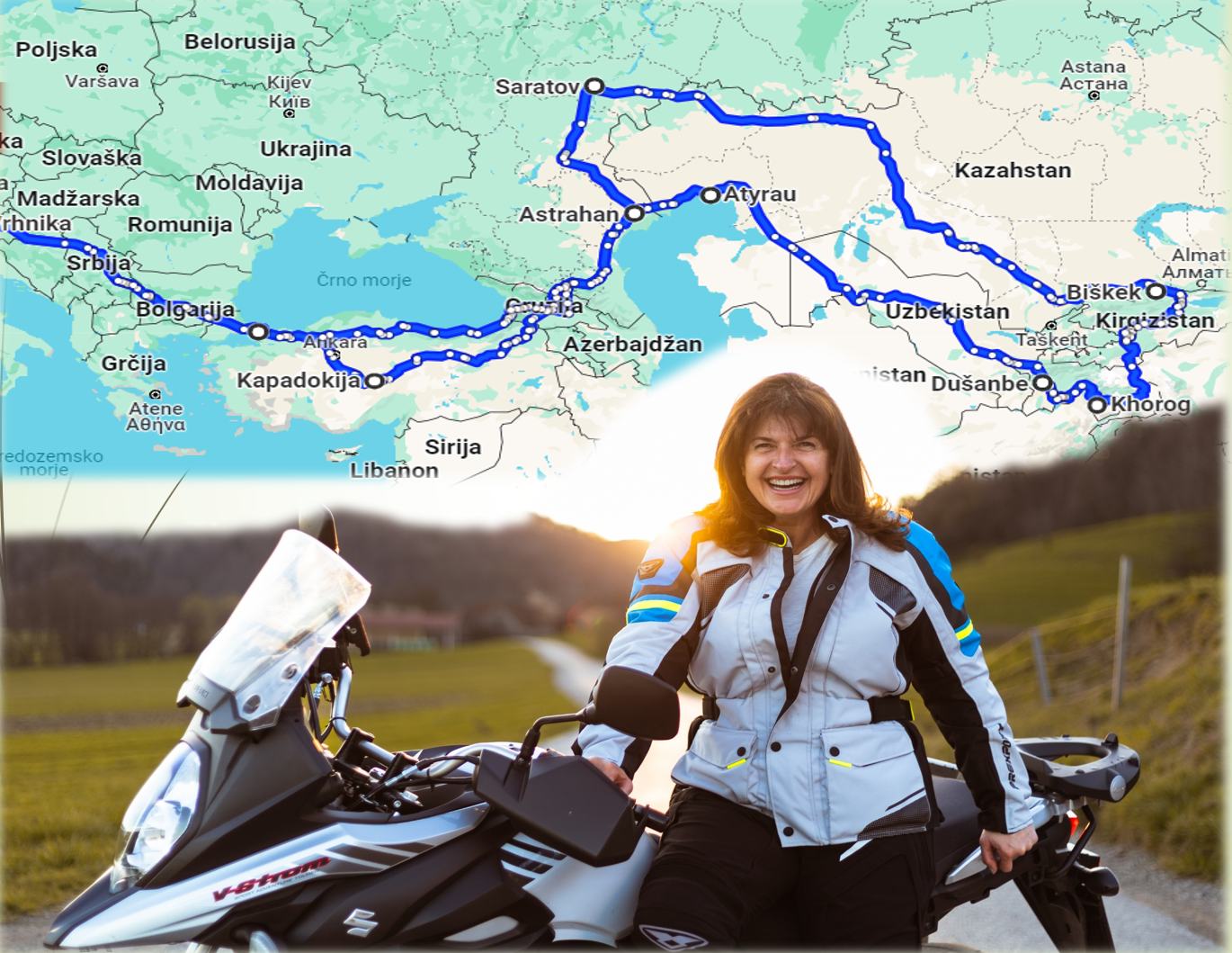 Preko Hrvaške, Srbije, Bolgarije, Turčije, Gruzije, Rusije, Kazahstana, Uzbekistana, Tadžikistana, Kirgizije in domov, jo je pot pripeljala do afganistanske in kitajske meje, pa tudi na najvišji prelaz Ak-Baital, visok 4655 metrov v Pamirju.