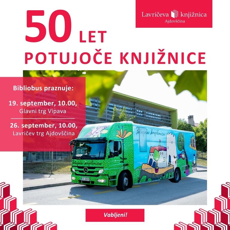 V petek, 26. septembra, bo na Lavričevem trgu ob 10. uri dan odprtih vrat Potujoče knjižnice. 50-letnica delovanja Potujoče knjižnice sega v leto 1975, ko je bibliobus prvič zapeljal na knjižno pot proti Gori. Pomemben jubilej pa bomo obeležili s krajšo slovesnostjo na trgu, kjer bogat program za otroke pripravlja Sten Vilar.