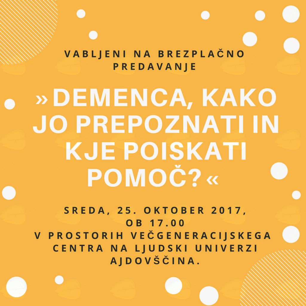 V sredo, 25.oktobra 2017, ob 17. uri bo v prostorih Večgeneracijskega centra na Ljudski univerzi Ajdovščina potekalo brezplačno predavanje ALZHEIMER CAFFE: Demenca, kako jo prepoznati in kje poiskati pomoč?