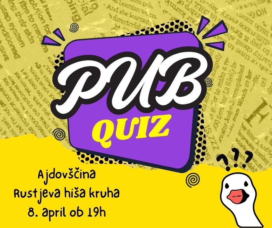 O PubQuizu: Pub Quiz je sproščen dogodek, ki tradicionalno izvira iz angleških pubov. Ekipe tekmovalcev odgovarjajo na vprašanja iz različnih kategorij in preverjajo svoje splošno znanje. Za posebno doživetje poskrbi prav mešanica znanja, sreče in skupinskega dela. Kviz je sestavljen iz 10 kategorij po 5 vprašanj, traja pa do približno dve uri. Vabljeni na Pub Quiz v Rustjevo hišo kruha!