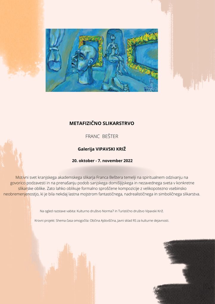 Kulturno društvo Norma 7 vabi na ogled likovne razstave akademskega slikarja Franca Beštera z naslovom METAFIZIČNO SLIKARTSVO. Motivni svet akademskega slikarja Franca Beštera temelji na spiritualnem odzivu na govorico podzavesti in na prenašanju podob sanjskega, domišljijskega in nezavednega sveta v konkretne oblike. Razstava je del krovnega projekta SHEMA ČASA, v organizaciji KD Norma7, in bo na ogled do 7. novembra 2022. Projekt podpirata Občina Ajdovščina in Javni sklad republike Slovenije za kulturne dejavnosti.