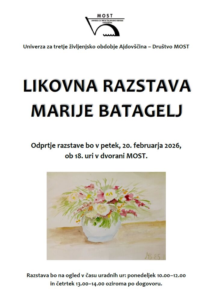 Vabimo vas na odprtje likovne razstave Marije Batagelj, ki bo v petek, 20. 2. 2026, ob 18. uri v dvorani UTŽO Ajdovščina - Društva MOST.