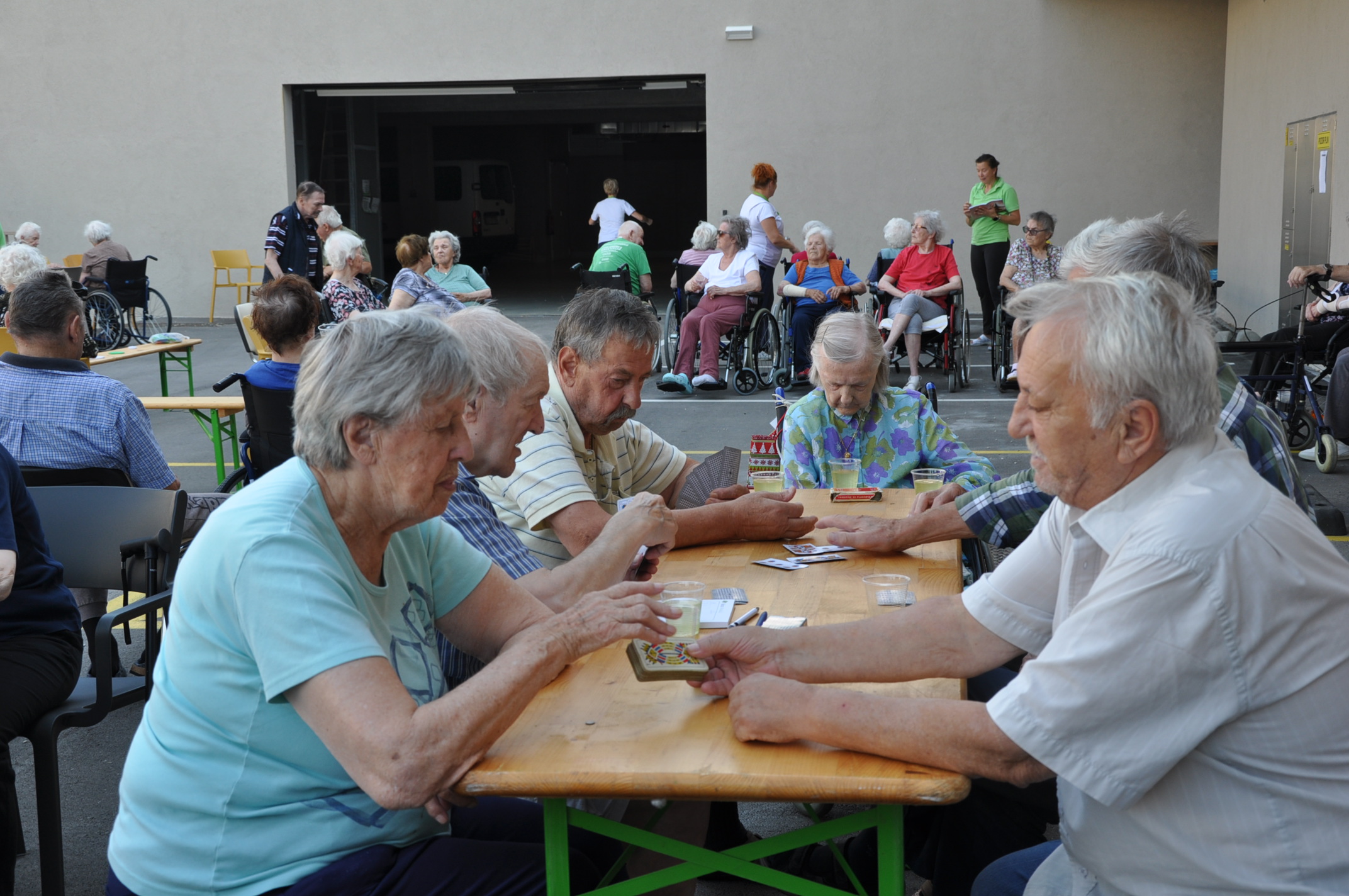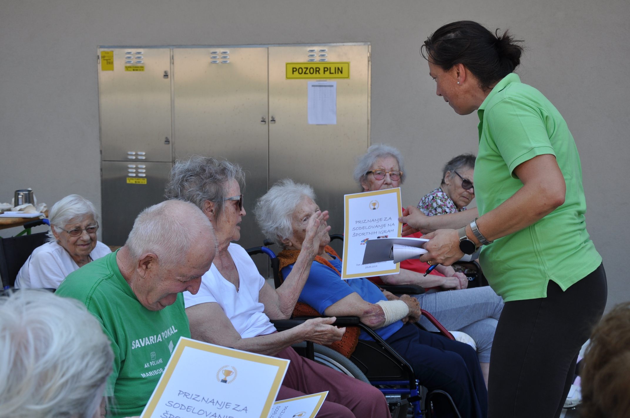 Takoj, ko so rahlo popustile vroče poletne temperature in je popihal veter, smo pod vtisom vseh športnih dogajanj, ki smo jih spremljali letošnje poletje preko televizijskih ekranov, pripravili svoje športne igre. Kar na dvorišču v senci smo se pomerili v večih disciplinah. V športnem in navijaškem duhu smo spodbujali prav vsakega, ki se je pridružil igram. Niso bile ovira ne bergle, ne palice niti vozički. Glavne nagrade tako za stanovalce, kot tudi za delavce pa so bili nasmehi, dobra volja, boljše počutje, prav vsak pa je na koncu prejel priznanje za sodelovanje.