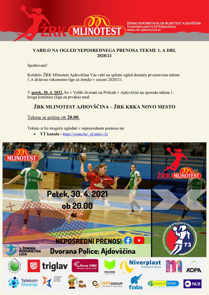 V petek, 30. 4. 2021, bo v Veliki dvorani na Policah v Ajdovščini na sporedu tekma 1. kroga končnice (liga za prvaka) med: ŽRK MLINOTEST AJDOVŠČINA – ŽRK KRKA NOVO MESTO.