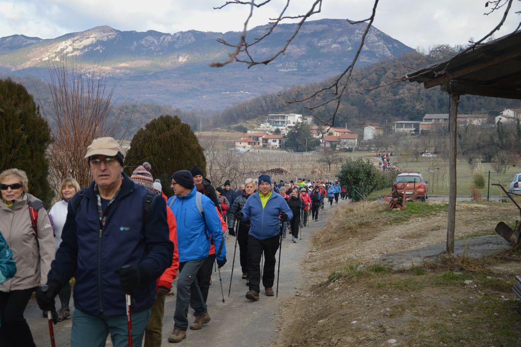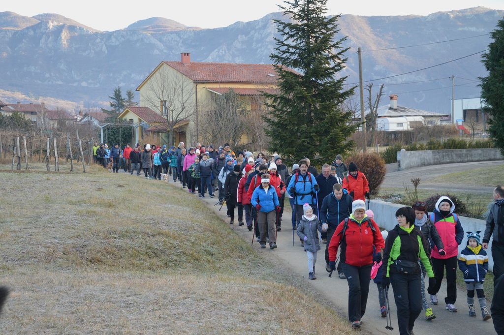 Pohodniki smo se zbrali v nedeljo, 6. januarja, pred Domom krajanov Cesta. Člani KS Cesta, Kulturno športnega društva Vrnivec Cesta in Balinarskega kluba Cesta so pohodnike postregli s pecivom in čajem/kavico. Po moji kratki predstavitvi tokratne poti in pozdravu Erika Štruklja (predsednik KS Cesta), se nas je približno 270 pohodnikov odpravilo po novi krožni poti okrog Vipavskega Križa proti Malim Žabljam. Tudi krožna pot je nova pridobitev, ki se jo je uredilo v okviru projekta Moja pobuda v lanskem letu.