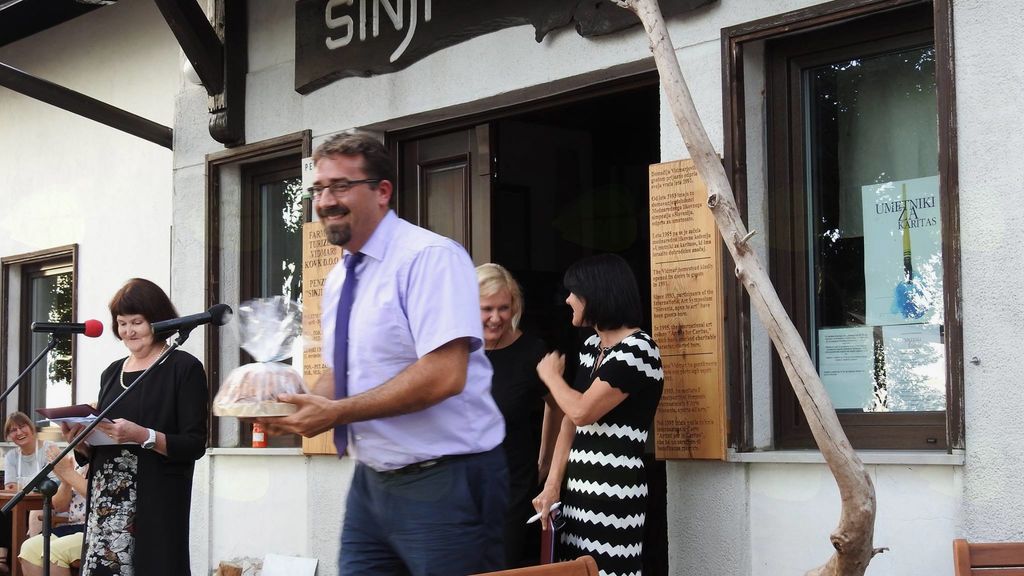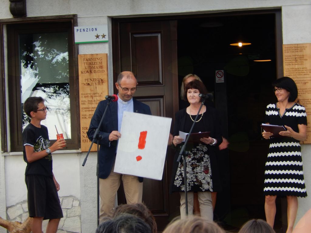 Navzoče je pozdravil tudi generalni vikar koprske škofije Slavko Rebec, ki se je umetnikom tudi pisno zahvalil. Poleg zahvale so dobili v spomin tudi županovo vino in sinjevrški sir. Poleg številnih uglednih gostov nas je obiskala tudi gospa Ljudmila Novak, ki že vsa leta spremlja Umetnike za karitas, saj je v funkciji ministrice za Slovence po svetu odprla razstavo v Trstu in na Dunaju, spada pa tudi med stalne darovalce – posvojitelje likovnih del. Tudi gospod župan ni ostal brez darila; v duhu razstave v Rimu, ko smo papežu Frančišku podarili potico smo se odločili, da enako potico, kot jo je za papeža spekla Marinka iz Višenj podarimo tudi našemu županu…zakaj pa ne, tudi 'županova potica' je lahko promocija naše doline!?
