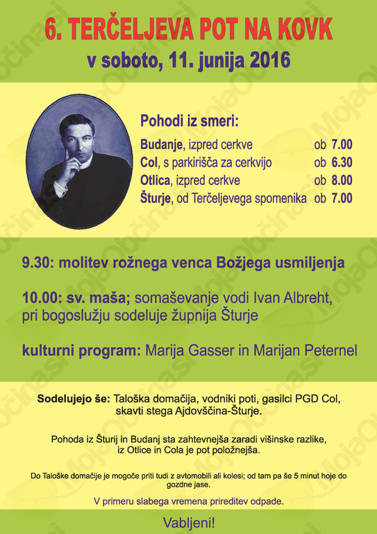 Pohodi bodo krenili iz Šturij, Budanj, Cola in Otlice na gozdno jaso »Pod ta novo potjo« na Kovku 19, kjer bo ob 9.30 molitev rožnega venca Božjega usmiljenja. Ob 10. uri bo sv. mašo daroval šturski duhovni pomočnik in letošnji občinski nagrajenec, g. Ivan Albreht. Po sv. maši bo Marija Gasser iz Železnikov predstavila svojo knjigo Vasi pod Ratitovcem skozi čas in pojasnila okoliščine Terčeljevega bivanja v Davči. Za kulturni program bo poskrbel Marjan Peternelj, ljudski pevec iz Sorice. Do domačije »Na Logu« je mogoče priti tudi z avtomobili ali kolesi, od koder je še nekaj minut hoje do gozdne jase, kjer bo potekala prireditev.