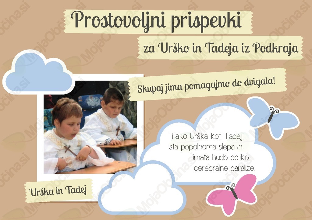 Vsi, ki bi radi pomagali pri nabavi dvigala, lahko svoj prispevek nakažete na Karitas vipavske dekanije, Ajdovščina, Vipavska cesta 11. TRR SI56 0475 1000 0867 279, sklic SI00 1997, namen: dvigalo za Urško in Tadeja.