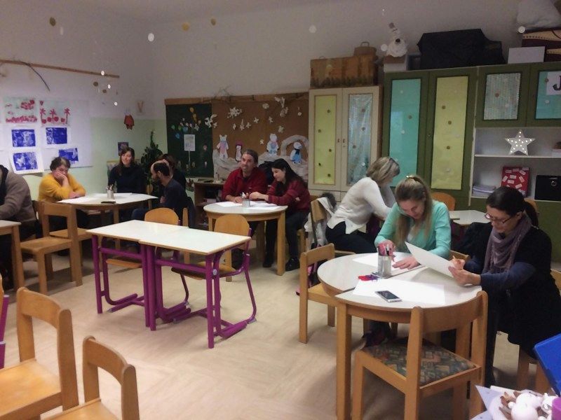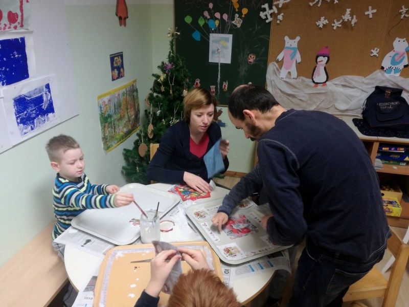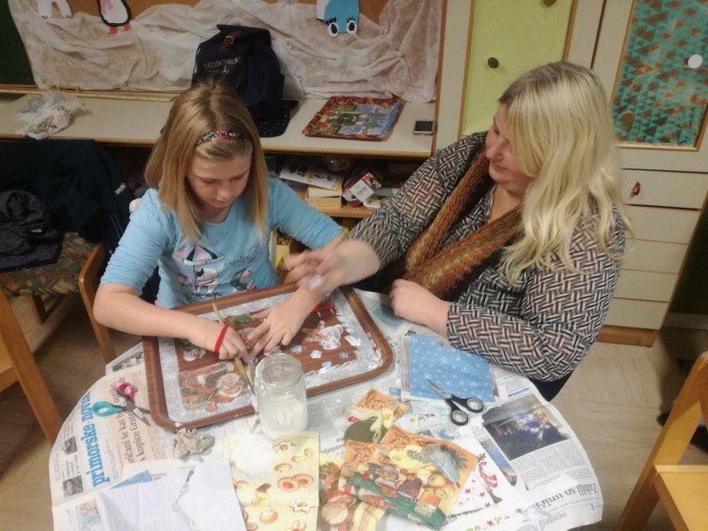 Veliko obiskovalcev je prišlo in začeli smo ustvarjati. Vsak učenec je dobil star lesen pladenj in ga s pomočjo družine spremenil v novoletni pladenj. Za to smo uporabili papirnate prtičke z novoletnimi motivi, malo lepila in vode. Nastali so unikatni, očarljivi pladnji. Najlepše pa je bilo prav to, da so starši in otroci pri izdelavi sodelovali.