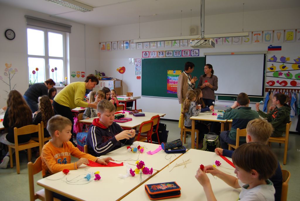 V drugi skupini so bili zbrani učenci, ki radi ustvarjajo s papirjem. Skupino so vodile ga. Anja Praček, Hilda Koren in Jožica Kodele. Učenci so pod njihovim vodstvom ustvarjali rože iz krep papirja. Vsi so bili pri delu vztrajni in kreativni. Tako so izpod njihovih prstov nastajal manjše in večje živopisane rože, ki so učilnico spremenile v cvetoč vrt. Šopki, ki so jih ob tej priložnosti ustvarili, pa bodo krasili tudi njihove domove.