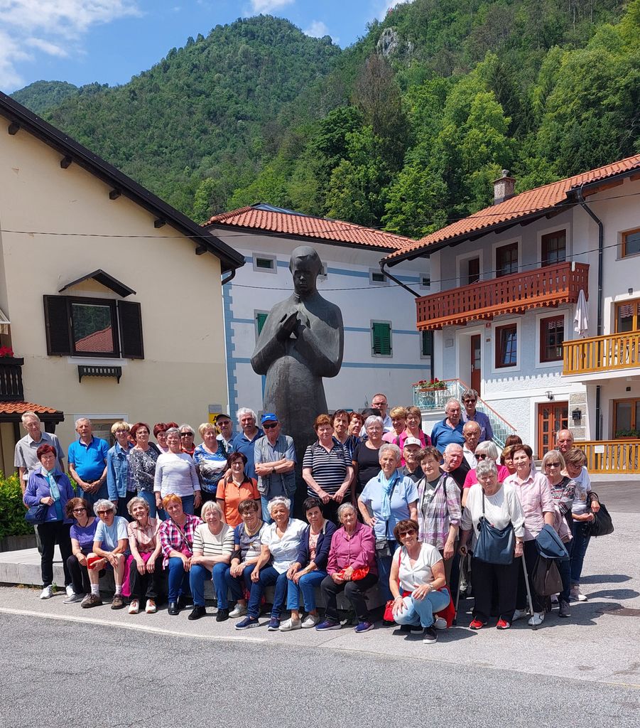 Prav tja po dolini in navzgor ob Soči nas je vodila pot 3. junija, ko se je 51 članov DU odpeljalo na izlet. Prekrasen pogled na to izjemno lepo, smaragdno barvo reke, na hribe, ki jo obdajajo, nas je navdušil že takoj, ko smo se iz Solkana odpeljali ob njeni strugi. Že na avtobusu je Marjeta recitirala Gregorčičevo Nazaj v planinski raj in to tako doživeto, da je marsikateremu zastal dih.