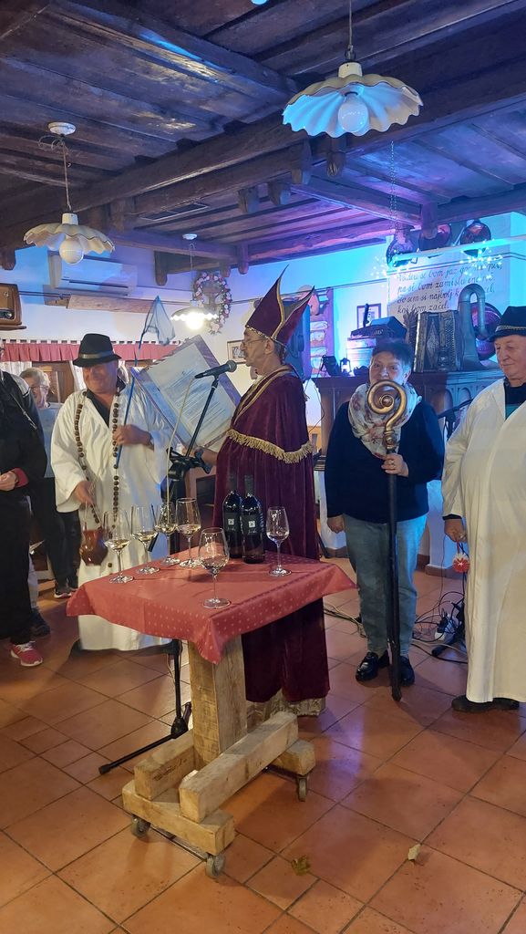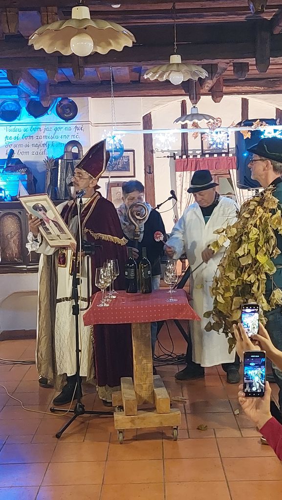 Blagoslov mošta na hudomušen način je opravil ta pravi škof Martin s svojim spremstvom. Obrani trsek, odet v trtne liste, je prisostvoval obredu. V pomoč je bil tudi župnik, ministrant s kadilom v majolki, dve nuni sta brali odpeve in tudi naš Marjan je zastopal Primorsko in je pridno testiral vino iz 'flaškona'. Vmes so se skrbno posvetovali z Bogom – pokušali pridelano in se končno odločili, da je vino dobro in ga lahko pijemo ta dan in še vse leto do naslednjega Martina.