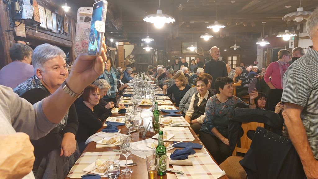 Prehitro je bilo treba naprej. V gostišču pod Roglo so nas v restavraciji čakali že na vhodu z aperitivom. Vstopili smo v prostor, krasen ambient, dovršena arhitektura, pogrnjene mize, spominjalo je na Toskano. Ob okusnem martinovem kosilu sta nam zaigrala in zapela glasbenik in pevka z izbranim glasom tako, da so nas v trenutku zasrbele pete ...