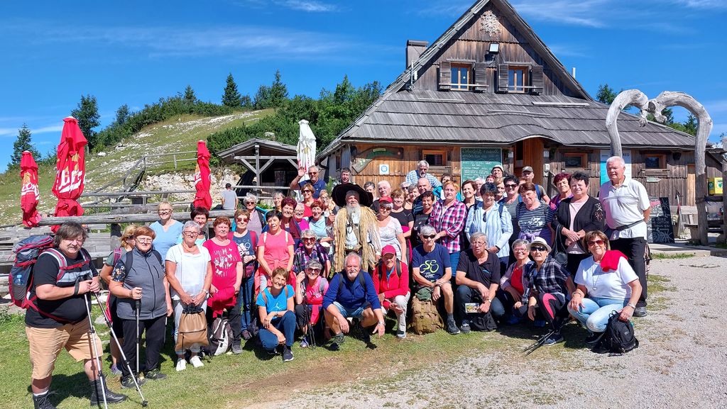 Že pred deveto je Stojan parkiral v Slovenski Bistrici pod nihalko in zapeljali smo se do vrha. Seveda je bilo treba še dobre pol ure peš, vendar nam je bilo prelepo ob pogledu na prelepe Kamniške Alpe. Tisti, ki zaradi zdravstvenih težav tega niso zmogli, so se zapeljali s kombijem do Zelenega roba. Tam smo se zbrali vsi in se z vodnikom odpravili na ogled Velike planine. Dosti zanimivosti smo izvedeli, naša prva postaja je bila domačija Gradišek, kjer smo se okrepčali z odličnimi ajdovimi žganci in kislim mlekom. Za spomin nam je ostala lesena žlica z vgraviranim napisom.