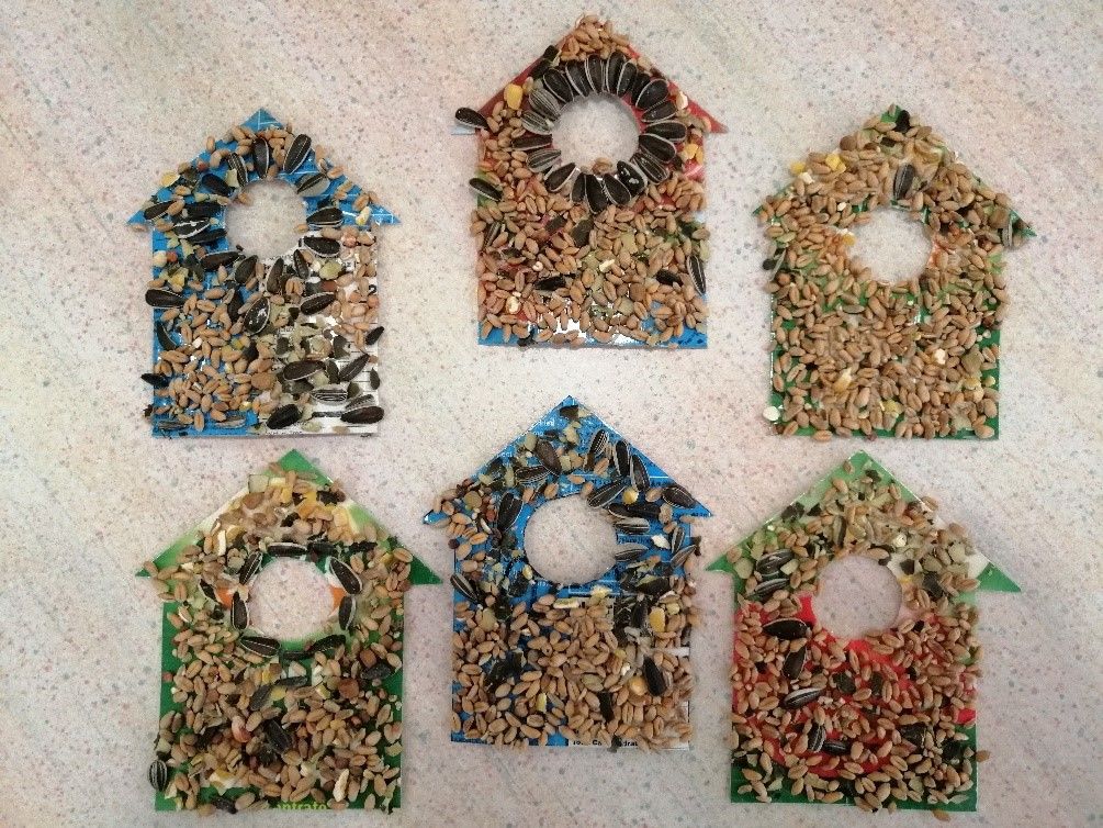 V sklopu projekta Mladost na burji smo iz odpadne tetrapak embalaže izdelali ptičje hišice, na katere smo zalepili semena in jih obesili po Vipavskem Križu ter tako nahranili lačne ptice. Ker je bilo navdušenje otrok nad izdelavo ptičjih hišic tako veliko, smo se odločili iz odpadne tetrapak embalaže izdelati še večje pisane ptičje krmilnice, ki so pregnale zimsko sivino. Ptice smo opazovali na sprehodih, jih poimenovali in poslušali njihovo petje, v ptičjo krmilnico pred vrtcem pa smo vsakodnevno odnašali semena, ki so jih otroci pridno prinašali od doma.