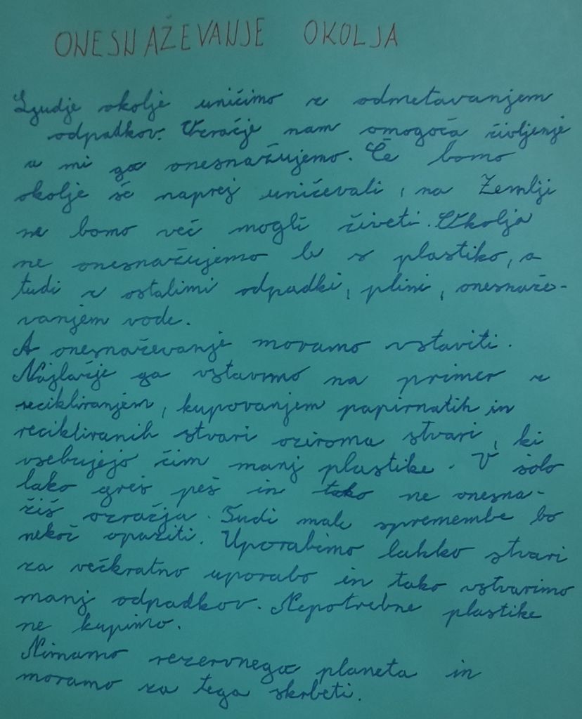 V nadaljevanju ure so učenci zapisali svoje misli, ustvarili stripe, pesmi, uganke in rebuse na temo varovanja okolja. Izdelki so bili razstavljeni na panoju pred šolsko knjižnico, v šolski knjižnici pa je nastala priročna razstava knjig s tematiko varovanja okolja.