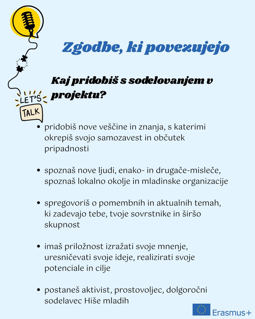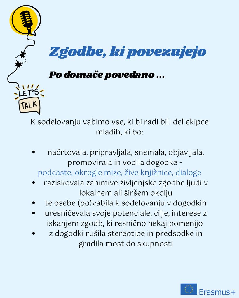 Zgodbe, ki povezujejo, je projekt, ki predvideva aktivno sodelovanje mladih pri naslavljanju aktualnih in pomembnih družbenih vprašanj skozi serijo podcastov, okroglih miz, živih knjižnic in dialogov, z namenom ozaveščanja širše javnosti in vzpostavljanja medgeneracijskega in medkulturnega dialoga.