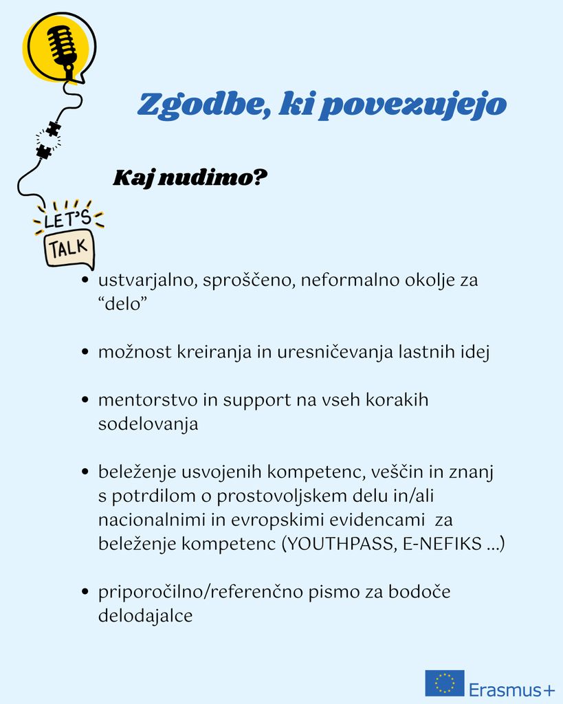 Nastala je pobuda o kreiranju dogodkov, ki bi jih načrtovali mladi in z njimi spodbujali svoje sovrstnike in širšo javnost k pripovedovanju in deljenju življenjskih zgodb in tako krepili povezujočo skupnost. Nastala je ideja o zgodbah, ki bi povezovale, zidale most med generacijami, kulturami ter most med mladinskimi organizacijami in mladimi . Nastal je projekt Zgodbe, ki povezujejo.