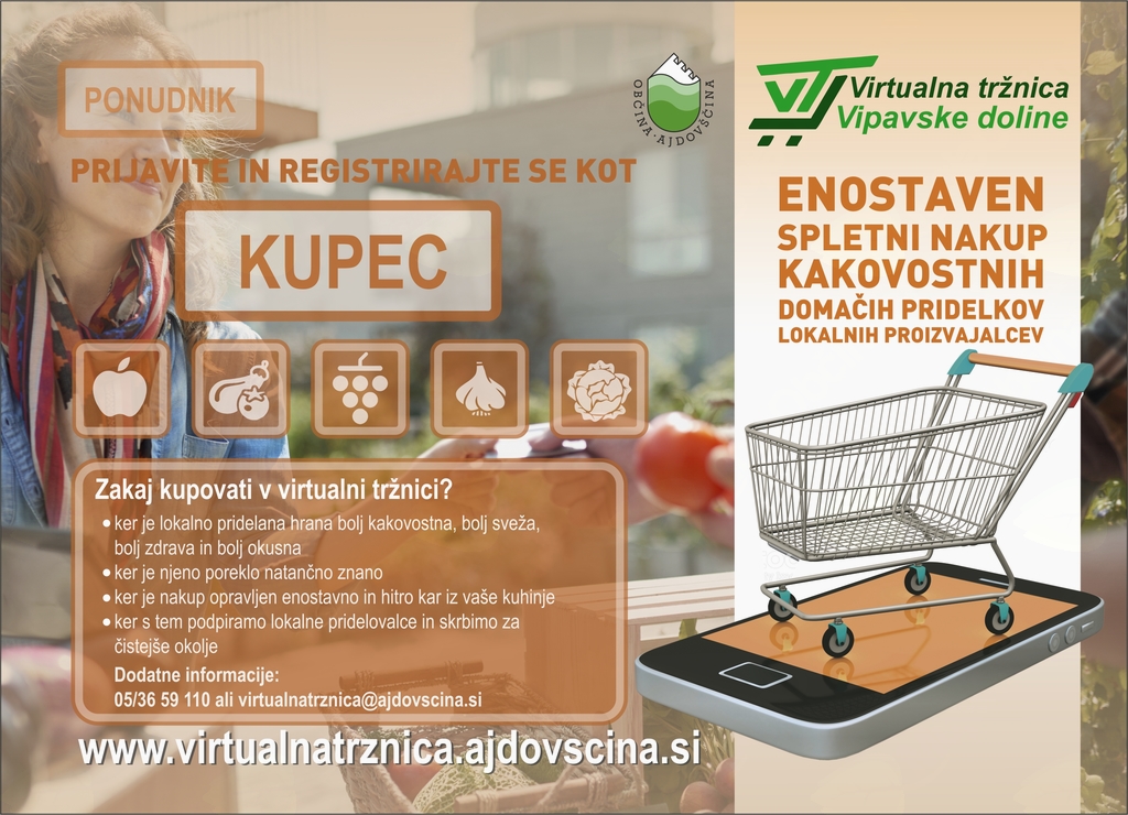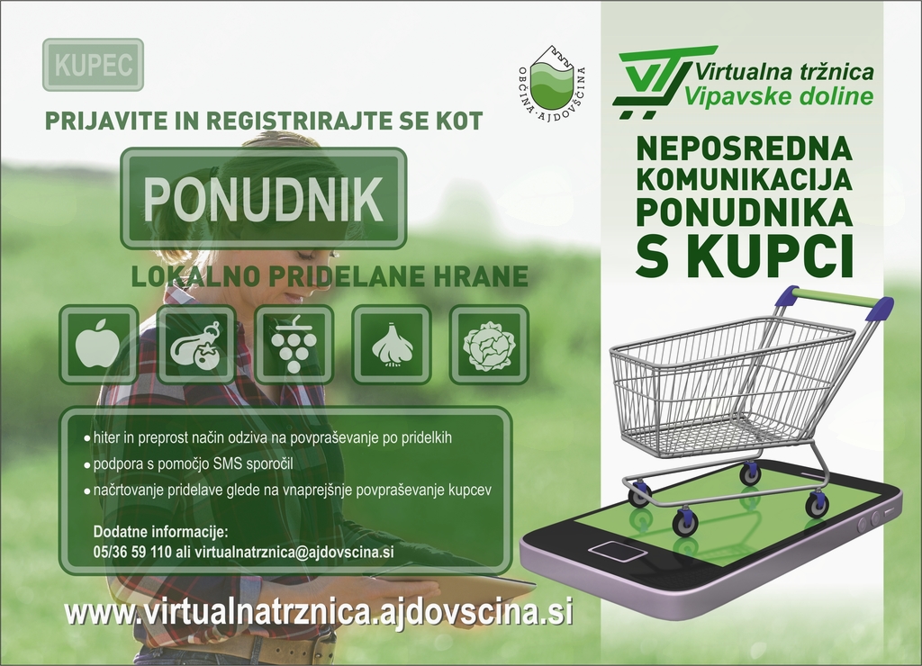 Občina Ajdovščina vabi vse ponudnike lokalne hrane in vse, ki podpirajo domačo lokalno oskrbo, da se s prijavo v virtualno tržnico pridružite našemu projektu in spremljate vse nadaljnje aktivnosti.