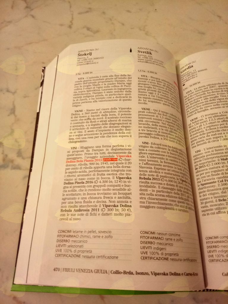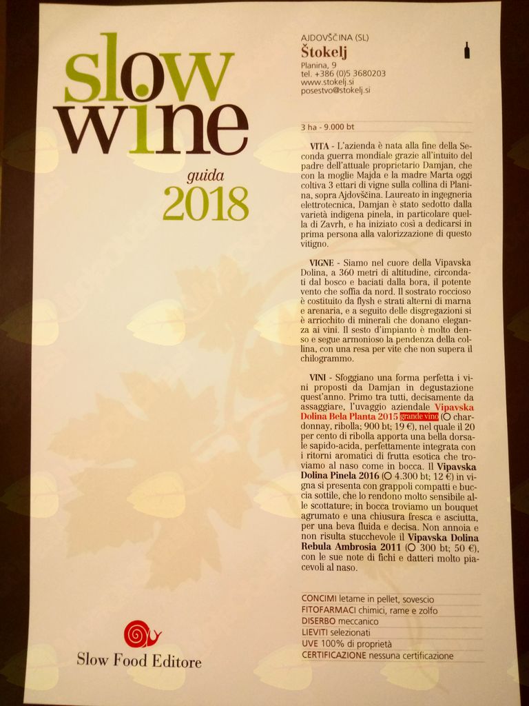 In v tej močni in veliki konkurenci skoraj dva tisoč kleti, med njimi tudi najboljših italijanskih, je oznako 'Seklenica' prejelo tudi Posestvo Štokelj, kar dokazuje, da so vsa Štokljeva vina izkazala visoko kvaliteto. Planta bela 2015, ki je tudi županovo vino občine Ajdovščina, je prejelo nagrado Grande vino (veliko vino), kar pomeni, da je Planta navdušila z visoko kvaliteto. Konkurenca je huda, raven ocenjevanja pa zelo visoka, saj je to nagrado prejelo le 175 vin! Poleg Štoklja je različne nagrade prejelo še 8 slovenskih kleti iz vinorodne dežele Primorske (med njimi Guerila s Planine), ki so se s svojimi nagrajenimi vini predstavile na degustaciji Slow Wine v Montecatini terme skupaj še s 500 v vodiču nagrajenimi kletmi.