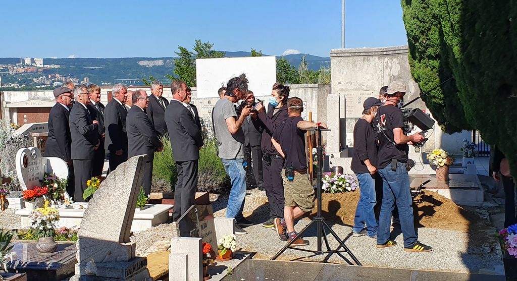 Film ‘govori’ o azbestozi, zaradi katere umreta dva lika, mož in žena v razmaku nekaj mesecev, v različnih letnih časih, kar pa je režiser v istem snemalnem dnevu (maja 2021) dosegel z različno svetlobo (zjutraj in zvečer) in ustreznimi oblačili. Tako so bili kosovelovci (na pokopališču v Miljah) na nogah od zore do mraka. Dopoldne so peli prvi del Borov in sicer v poletnih opravah, popoldne pa drugi del skladbe, tokrat v oblekah s kravato, kar je bilo zaradi močnega sonca kar zahtevno, še posebno za solista Aleša Kogoja, ki je znameniti solo odpel vsaj 15 krat. Peli so namreč tudi, ko niso bili v kadru, da so se glavni igralci lažje vživeli v vsebino Kosovelove pesmi in Srebotnjakove glasbe, ki je očitno Gergoletu zelo pri srcu.