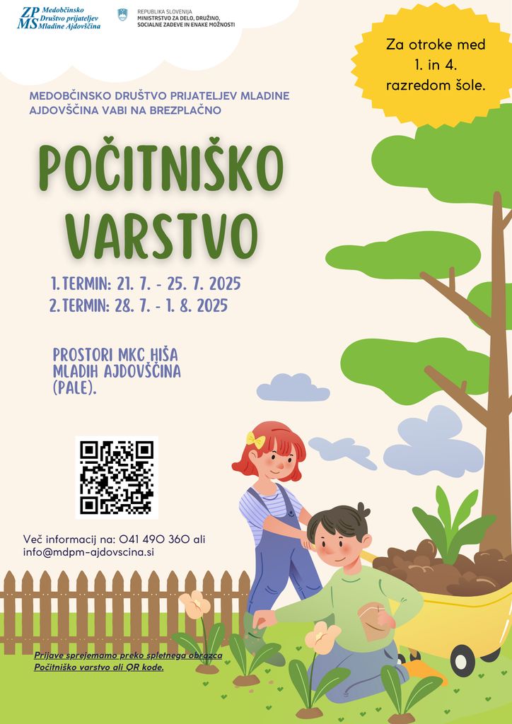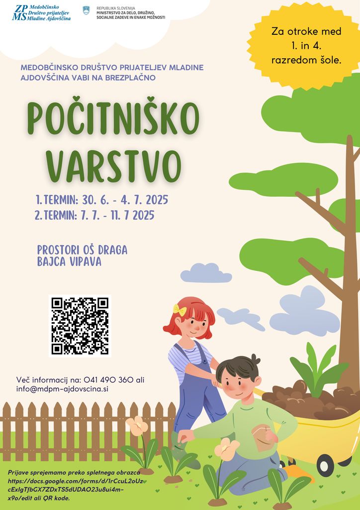 Vsak otrok se lahko udeleži vartsva v enem terminu. Število mest je omejeno – prijavite se čim prej preko QR kode ali spletnega obrazca https://forms.gle/ywkcMNgmgCiMJXqeA