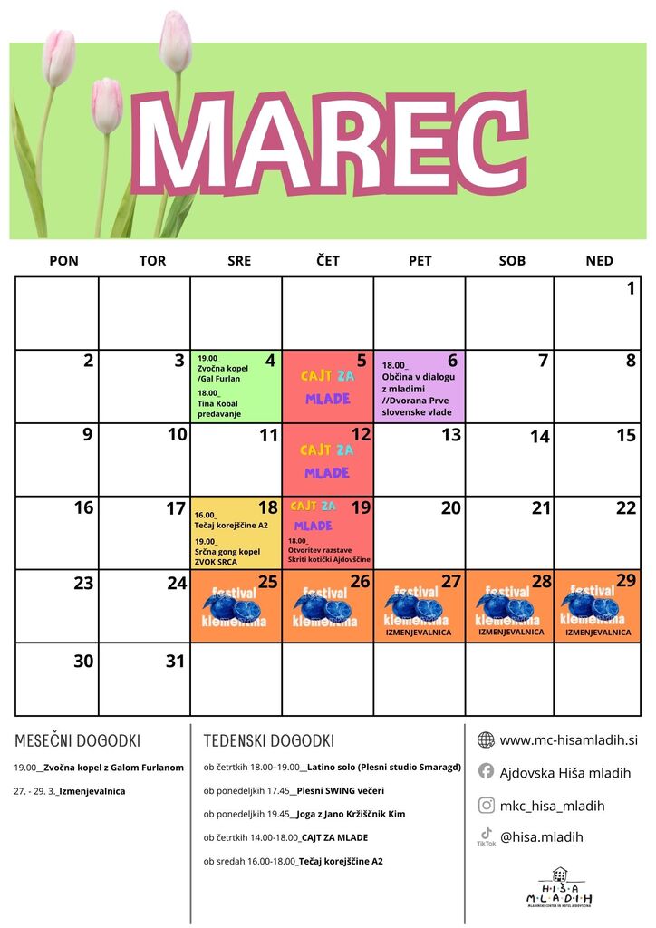 Marec v Hiši mladih prinaša raznolik program dogodkov, ki povezuje ustvarjalnost, druženje, znanje in sprostitev. Poleg predavanj, delavnic, razstav in večernih dogodkov v tem mesecu predstavljamo tudi novo redno mladinsko aktivnost CAJT ZA MLADE, namenjeno osnovnošolcem in srednješolcem, ki si želijo po šoli varnega prostora za učenje, druženje in kakovostno preživljanje prostega časa.