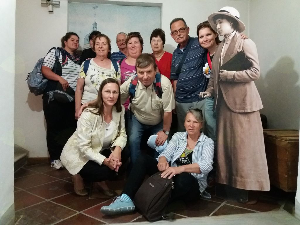 Letos se med našimi bralnimi srečanji družimo s knjigo Alme Karlin (1889-1950) Samotno potovanje. Pisateljica nas je navdušila s svojo vztrajnostjo slediti svojim željam in uresničiti pred sto leti nepojmljivo: postati svetovna popotnica in si ogledati svet. In to tako, da med domačini živiš, si z njimi deliš dobro in slabo in ves čas opazuješ, proučuješ in pridno zabeležiš vse kar vidiš okrog sebe. Knjiga nas je tako navdušila, da smo se odločili obiskati Almin rojstni kraj, Celje. V Pokrajinskem muzeju so tej svetovni popotnici, pisateljici, raziskovalki, poliglotki (obvladala je deset tujih jezikov, obenem pa zelo slabo govorila slovensko) in teozofinji, ki je v letih 1919-1927 prepotovala svet, postavili stalno razstavo. Prijazna kustosinja nas je popeljala po razstavi in predstavila, kako je Alma potovala sama, kontinuirano osem let in se po poti preživljala z lastnim delom. Narava njenega potovanja jo umešča med največje popotnike vseh časov. Čeprav slovenskega rodu, je bila vzgojena kot Nemka in tudi vsa svoja dela je napisala v nemščini. Zato smo jo Slovenci bolj slabo poznali, in šele v zadnjem času izhaja vse več prevodov njenih del. Na žalost zgodovinski čas druge svetovne vojne in tik po njej Almi ni bil naklonjen. Po težki bolezni je v revščini umrla v skromni hišici v Pečovniku pri Celju. Hiško so leta 2011 obnovili in jo kot spomenik lokalnega pomena namenili na ogled javnosti. Tudi mi smo preizkusili svoje fizične sposobnosti in se po več kot 180 stopnicah povzpeli do zadnjega domovanja te znamenite popotnice.