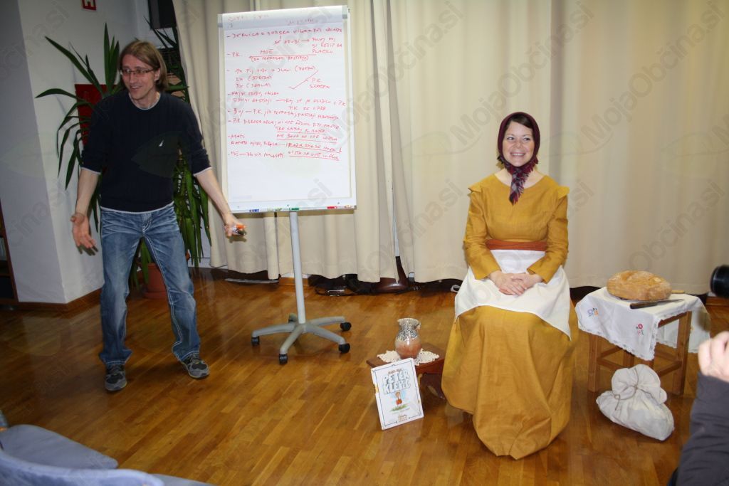 Na sceni, ki je pričarala kmečko idilo ob pogrnjeni mizici in velikem hlebu kruha, je pripovedovalka Mirjam Štih v obleki, ki je po dizajnu spominjala na tiste izpred davnih let, in z ruto na glavi, pripovedovala  pravljico o Petru Klepcu. Luka Hrovat je na tablo  pridno pisal beležke in po končani pravljici se je njegovo delo šele dobro začelo. Na podlagi beležk je poslušalcem ponudil svojo izvirno interpretacijo pravljice.
